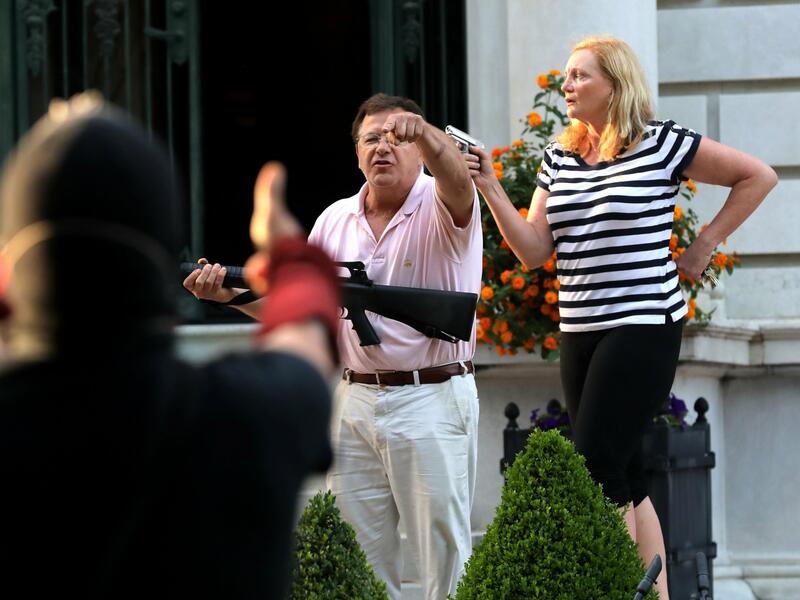 ST. LOUIS (AP) — A white couple pointed guns at protesters in St. Louis as a group marched toward the mayor’s home to demand her resignation after she read the names and addresses of several residents who supported defunding the police department during an online briefing.